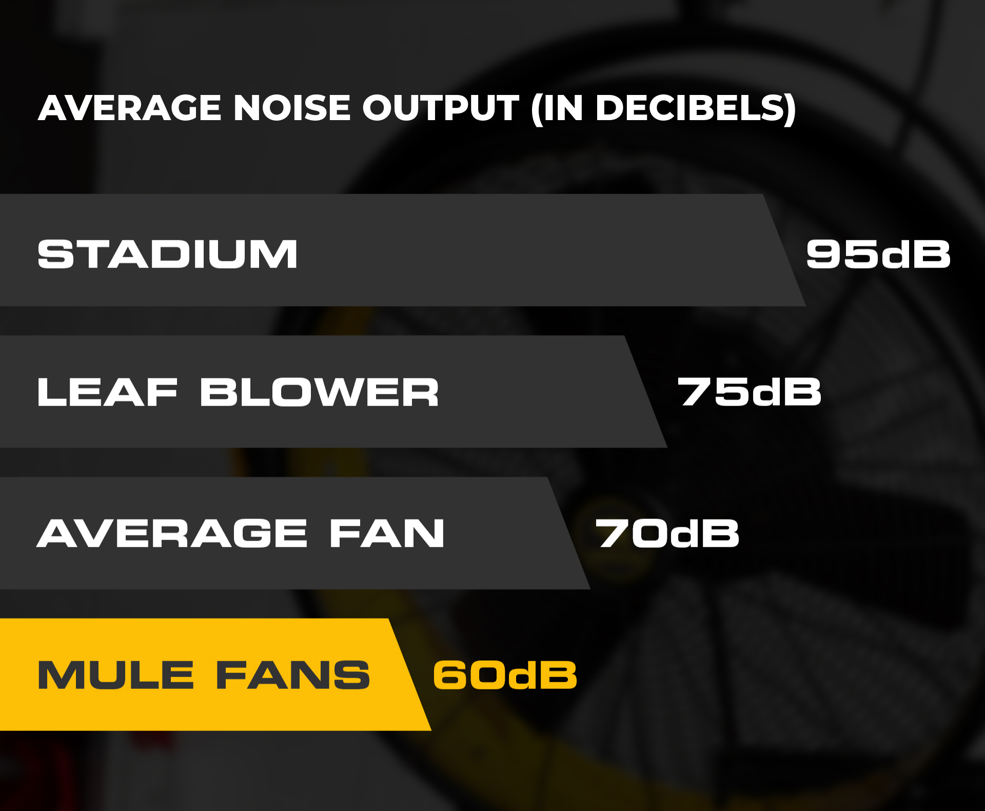 2. Lower noise level over 1 st generation Mule (Model 52010: 72.3 decibels (dB) vs. 52007: 79.1dB; A. King competitor model 72.9 dB) measured at highest speed. At lowest setting Mule 52010: 59.9dB. (Normal conversation: 60-70 dB).