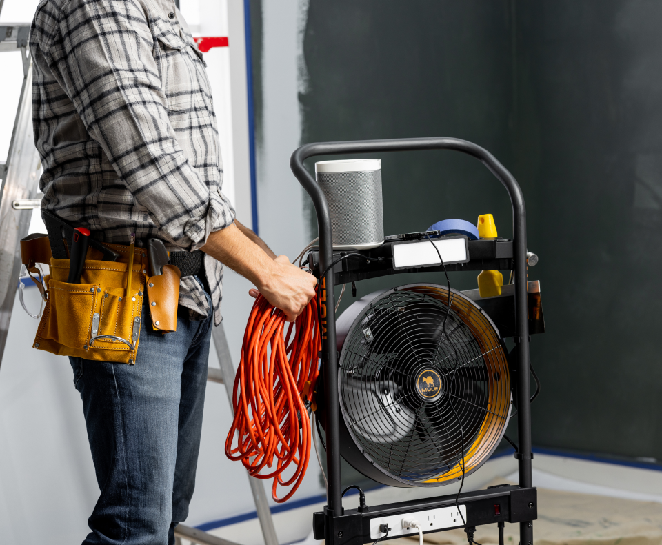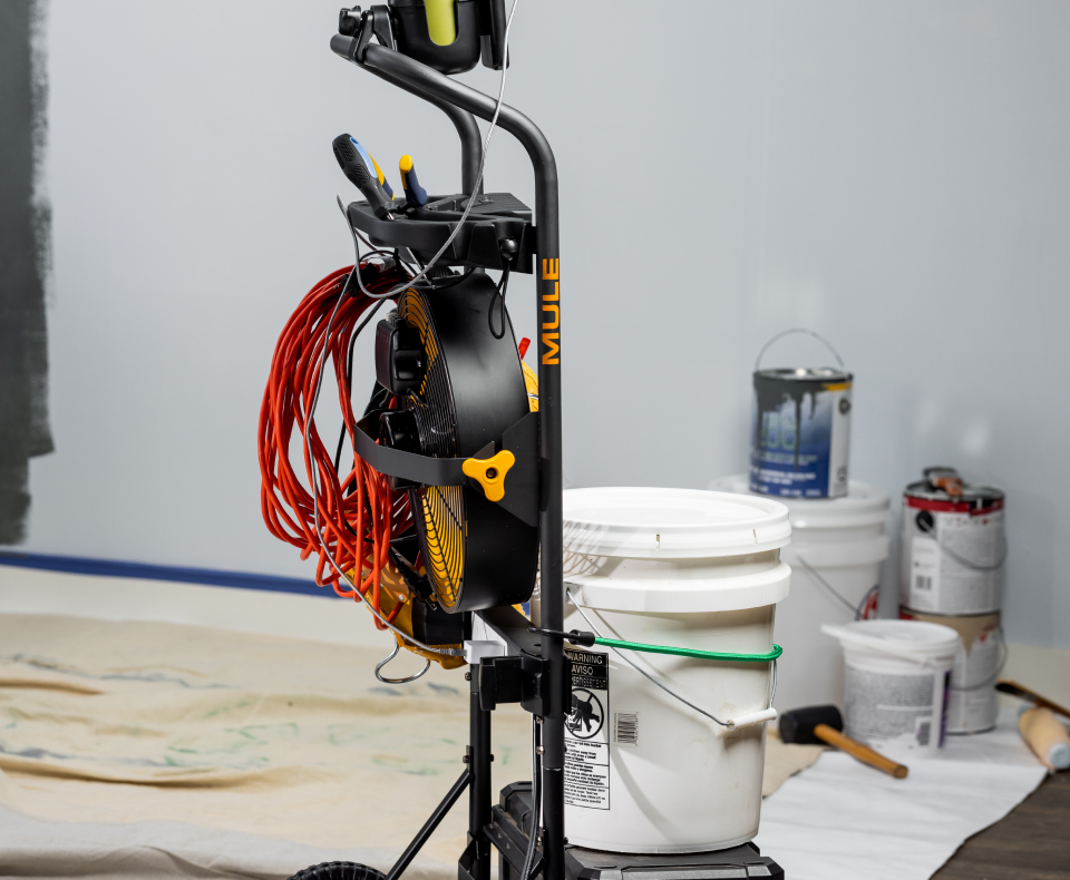 MULE 5-in-1 Mobile Workshop, integrated 3-speed fan, LED light, power strip, tool caddy, and 300lb capacity hand truck Designed to make everything ...